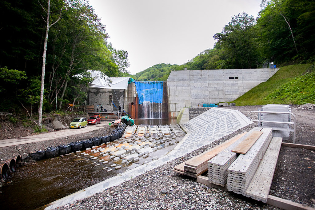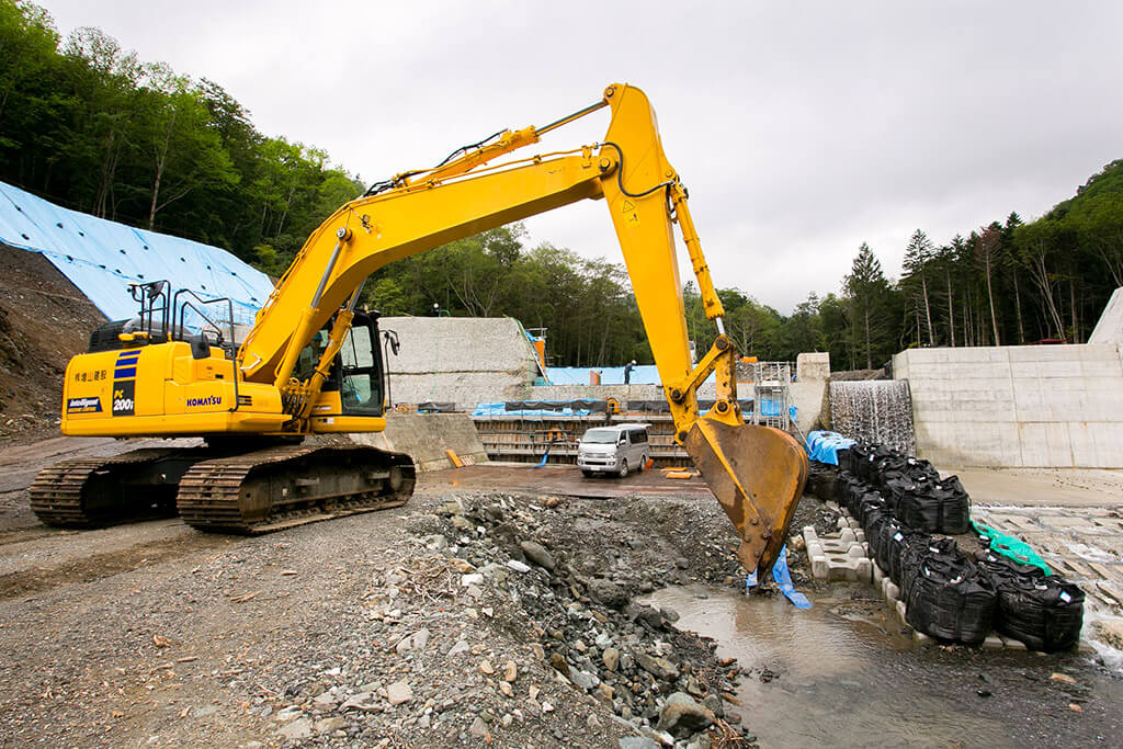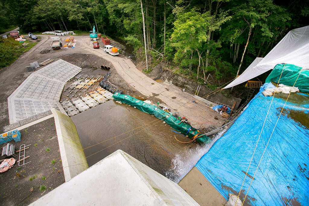 占冠村で砂防ダムを補修中。豪雨で土砂が河川に流れ込んだ時にせき止め、下流の地域を土砂災害から守る重要な施設だ