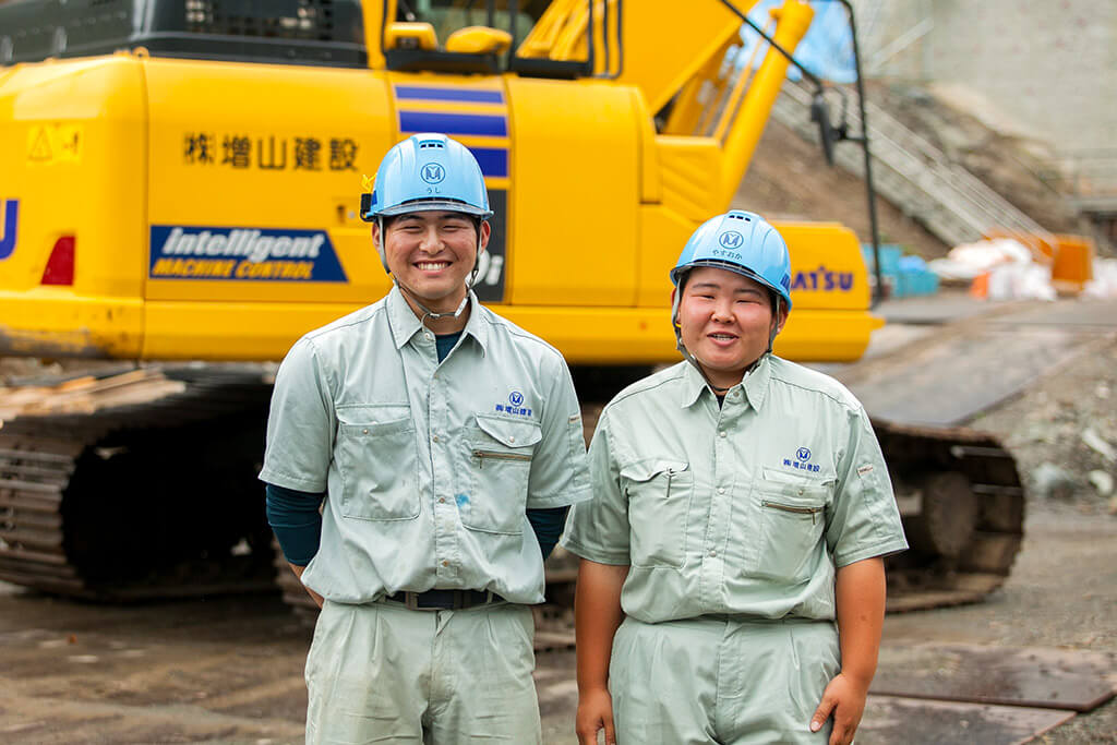 土木関係の資格も知識もゼロの人が、入社してから工事用車両の免許を取得し、重機オペレーターを目指す道もある。入社6年目の保岡未来さんと3年目の宇治匡也さんは、二人とも富良野生まれの富良野育ち。高校の普通科を卒業し、新卒で増山建設に入社した。