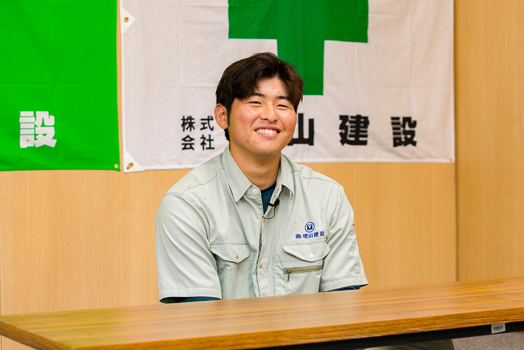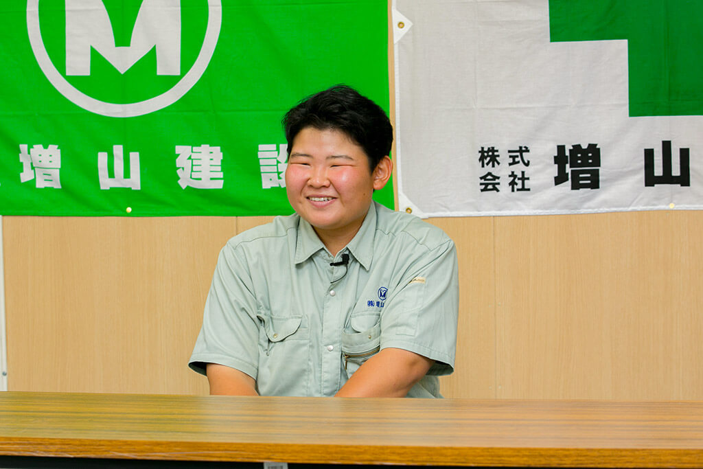 宇治さんは机に座りっぱなしの事務職より、体を動かす仕事がしたいと土木の道へ。増山建設を選んだのは「ほぼ直感」だったとか。企業説明会で井野さんの話を聞き、雰囲気が良さそうな会社だと思ったのが入社の動機だ。