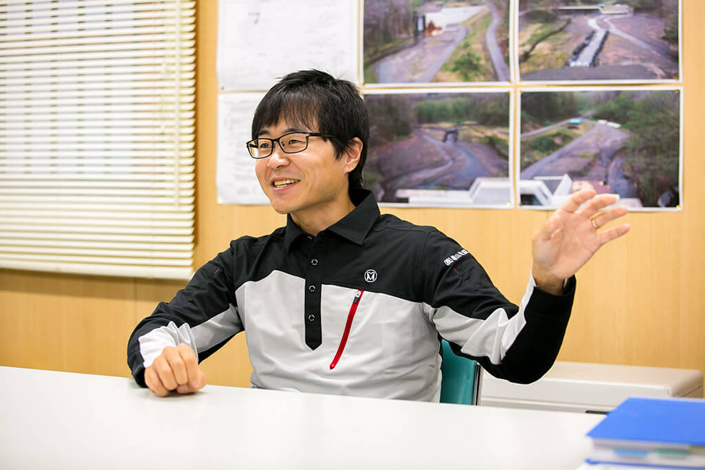 現場のまとめ役である現場所長にも、土木に必要な適性は何かを聞いてみた。入社13年目、社内の現場所長の中で一番若手の山内奨平さんは「協調性」だと考える。