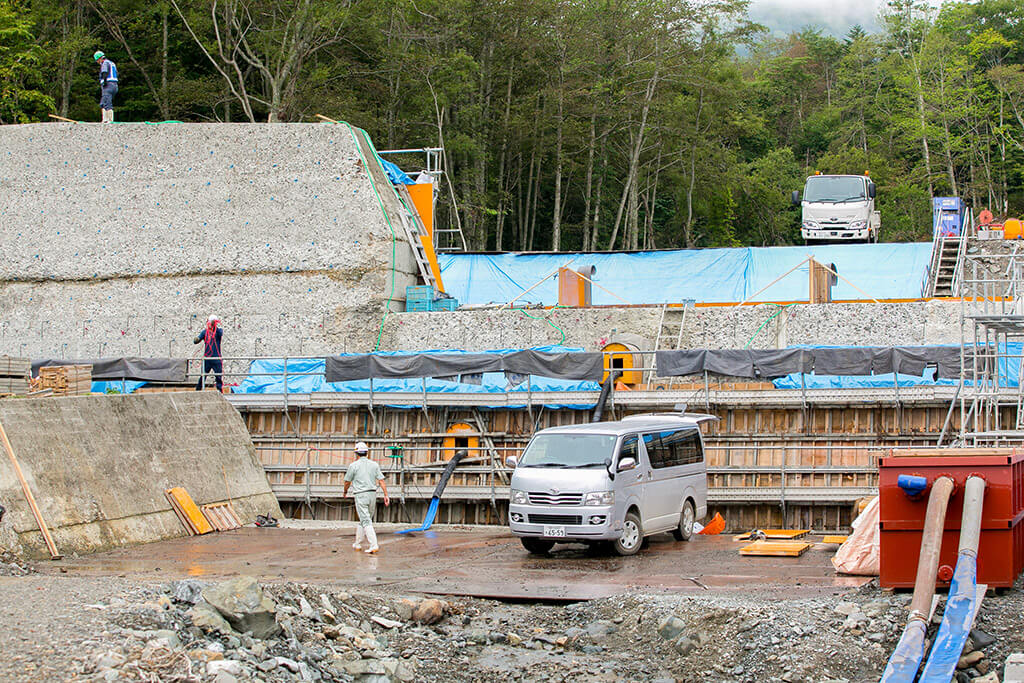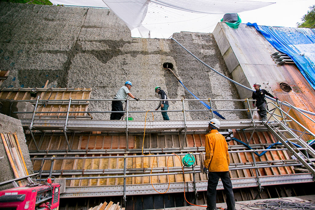 砂防ダムの表面を削り、型枠を組んで新しいコンクリートを流し込む。コンクリートが天候や気温の影響を受けないよう、注意しながら作業を進めていく