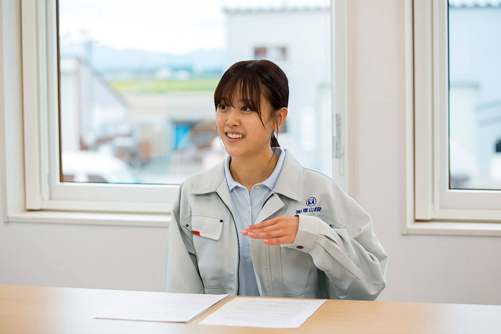 ハローワークで増山建設の求人を知り、未経験の事務にチャレンジしようと決意したのは、地域のインフラという大きなものに関われること、たくさんの人の役に立てることに魅力を感じたから。1年目は保険の手続きや給料計算、年末調整など先輩の手伝いからスタートし、2年目は工事台帳の作成や電話応対、仕入れのデータ入力と仕事の幅を広げてきた。建設業経理士2級を目指して勉強もしている。