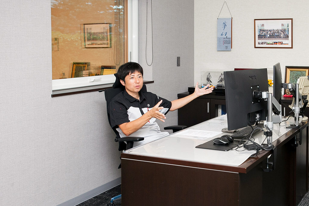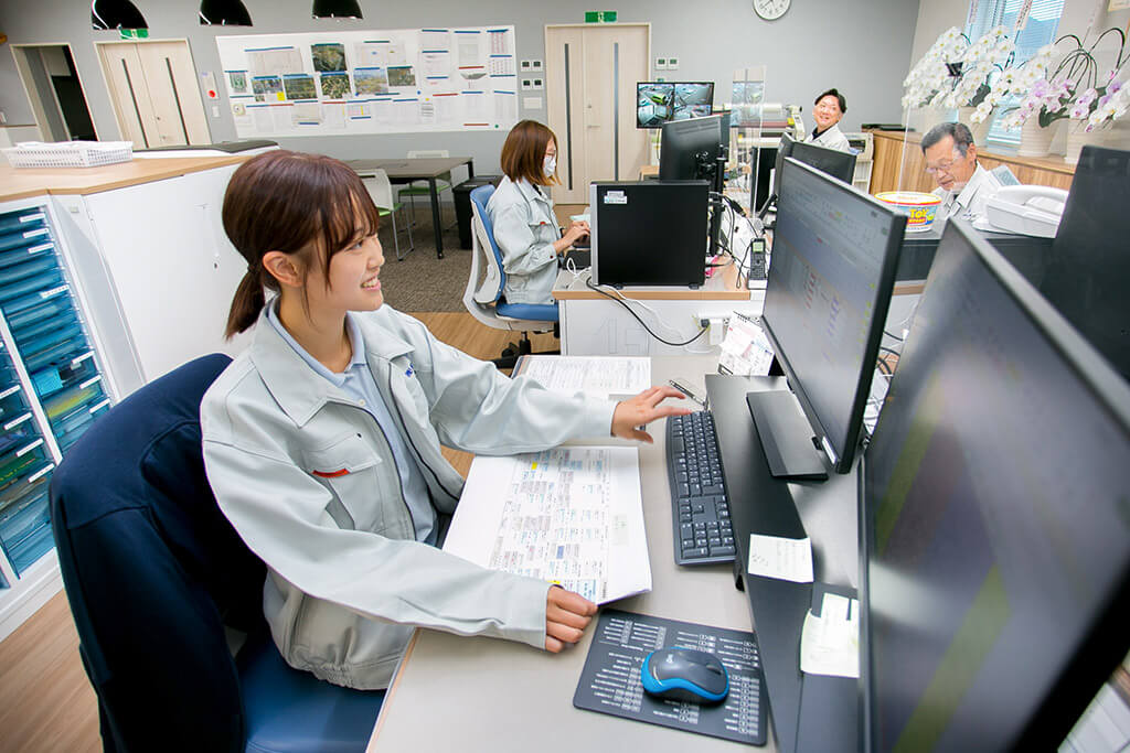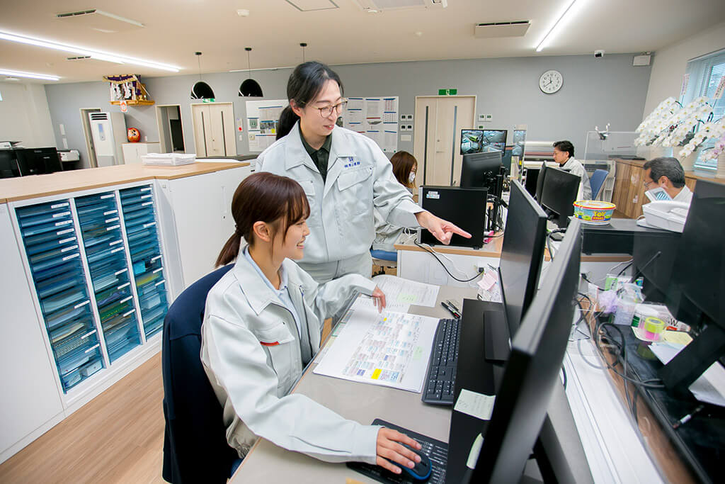先輩が自分の業務を進めながら後輩に目を配り、仕事を教える体制は現場もオフィスも同じ。尊敬する先輩を目標に成長していける職場だ
