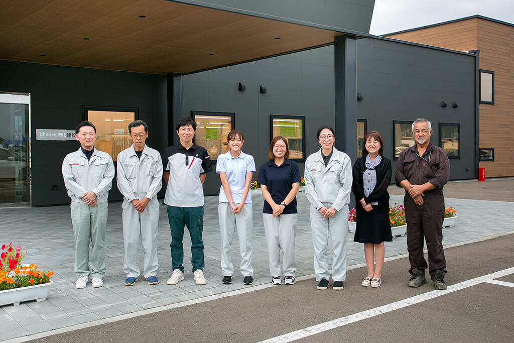 2023年に完成した新社屋の前で。北は上富良野町、南は占冠村まで、さまざまな現場で働く仲間たちをオフィスからサポートする