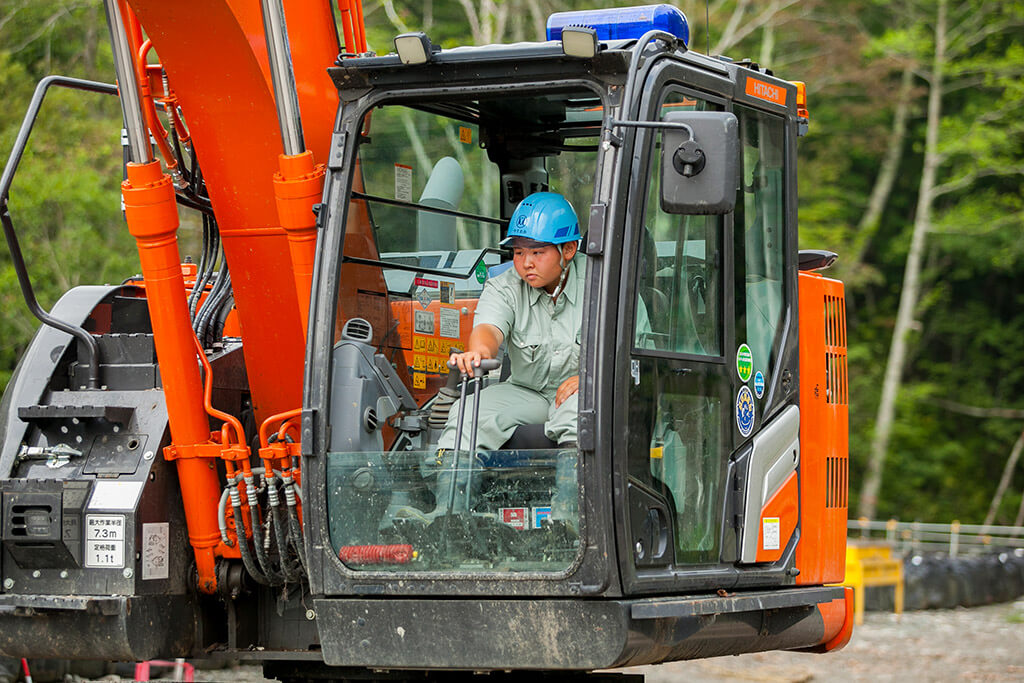 油圧ショベルを巧みに操る保岡さん。女性の重機オペレーターは社内第1号